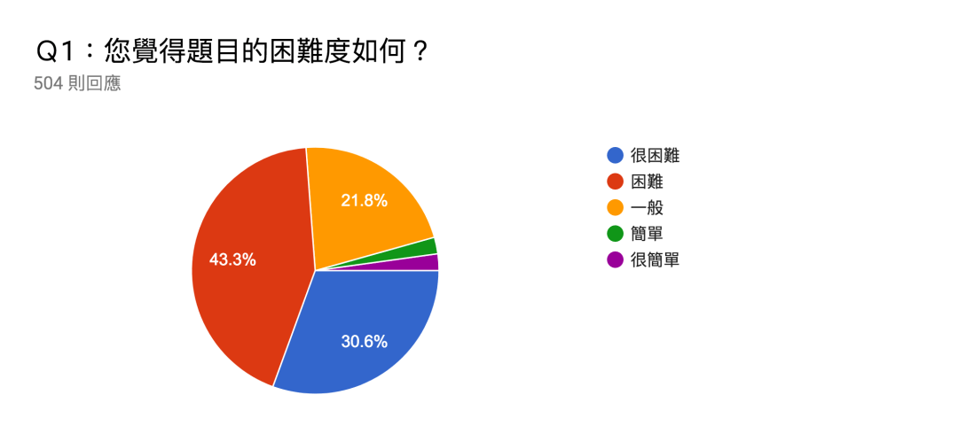 30.6%的朋友認為很困難、43.3%認為困難,21.8%認為一般,很少數的朋友會認為簡單或很簡單。換言之,這份試題是有相當的難度,並無法歸類到簡單。
