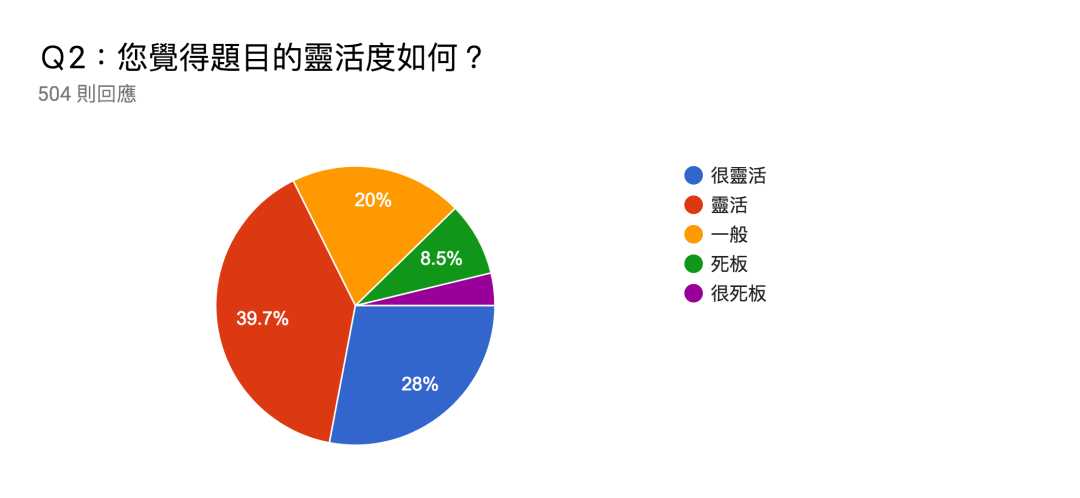 28%的朋友認為很靈活、39.7%認為靈活,20%認為一般,認為死板的只有8.5%、非常死板的3.8%。整體的評價,應該是認為有相當的靈活性。