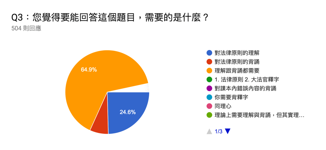 高達64.9%的朋友認為,理解跟背誦都需要;其次是對法律原則的理由,24.6%,7.2%的朋友表示這是對法律原則的背誦。