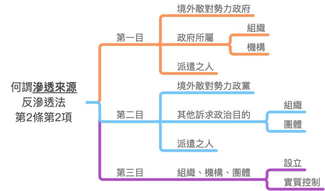 - 境外敵對勢力的政黨或其他訴求政治目的之組織、團體或前述派遣之人,
