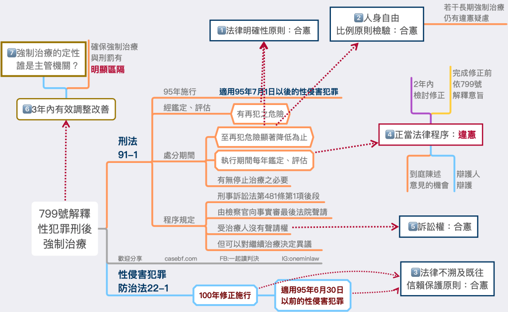 解釋文就到上面為止,但理由書第57段附帶提到,刑後強制治療本質上應該是一種由專業人員主導實施的治療程序,受強制治療者是立於「病人」的地位接受治療,以有效降低再犯風險為目的,並不是刑事處罰,這是799號解釋的立論基礎。