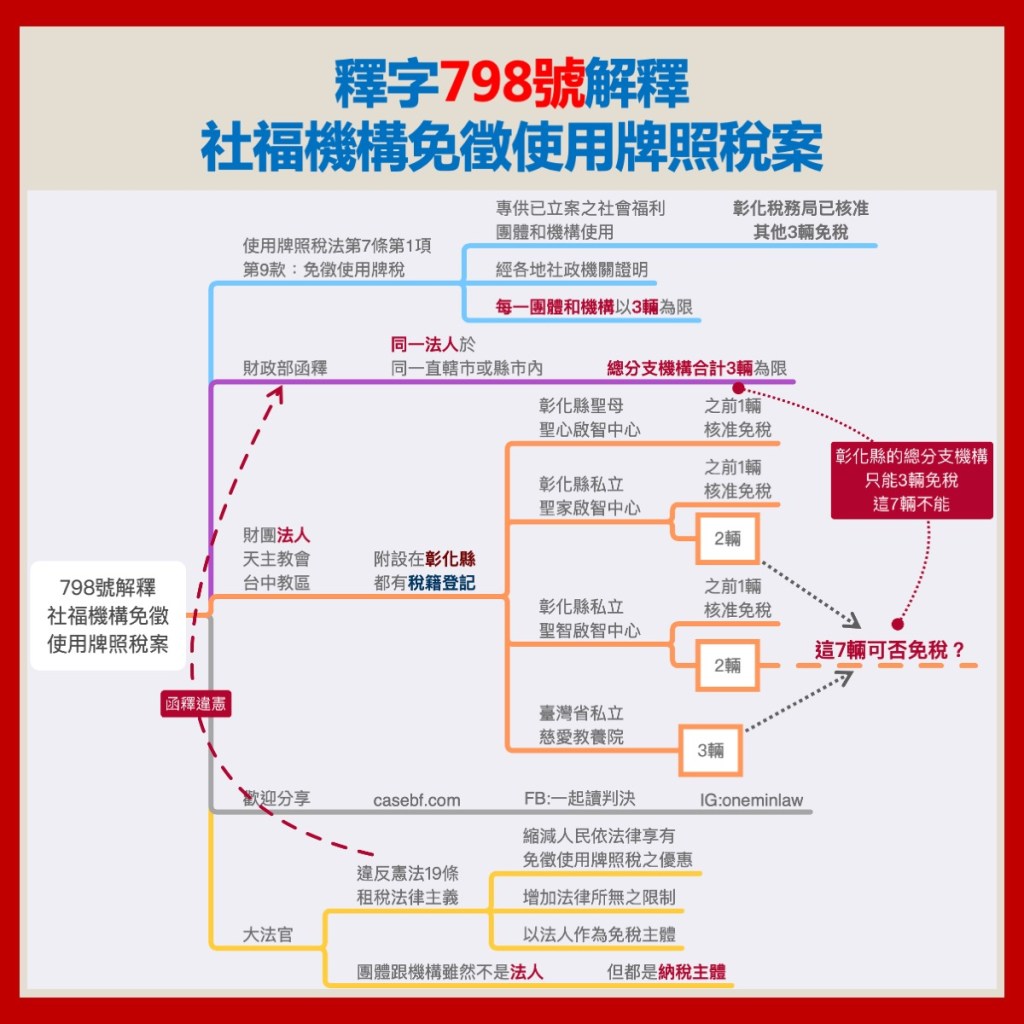 財政部的函釋限定同一行政區域內之法人及其附設之機構,應合併計算其免徵使用牌照稅之交通工具數量限額,形同以「法人」(財團法人天主教會台中教區),而不是「每一團體和機構」作為免稅主體,也限縮免稅客體的範圍,和法律規定的免稅要件不符合,違反立法意旨,增加法律所沒有的限制,違反憲法第19條的租稅法律主義。