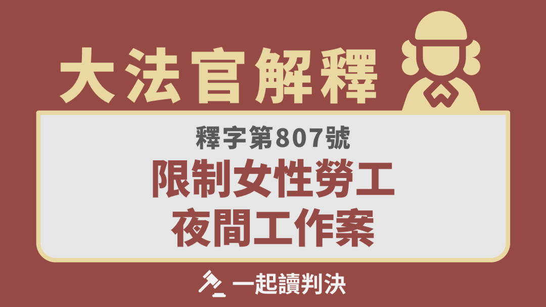 上週五(110年8月20日),大法官做出一號關於性別平等的大法官解釋(807號),以下來簡單介紹這號解釋的內容 … 繼續閱覽 807解釋:限制女性勞工夜間工作案