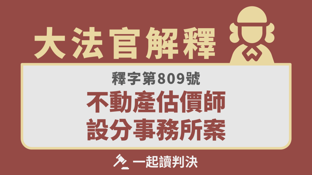 不動產估價師法規定,不動產估價師設立事務所,以「一處」為限,不可以設立分事務所。 洪姓估價師被檢舉設有「分所」 … 繼續閱覽 809解釋:不動產估價師設分事務所案