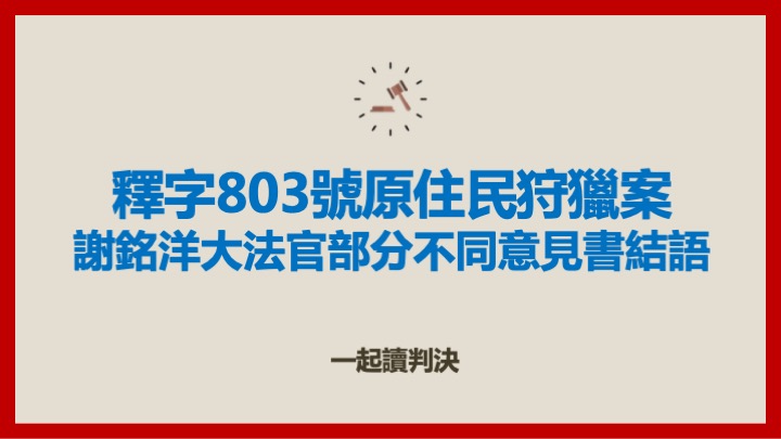 以下是謝銘洋大法官在803號解釋所出具的部分不同意見書中文末的結語,總結了這號解釋的結果及影響,分享給大家。 … 繼續閱覽 原住民狩獵釋憲案謝銘洋大法官部分不同意見書節錄