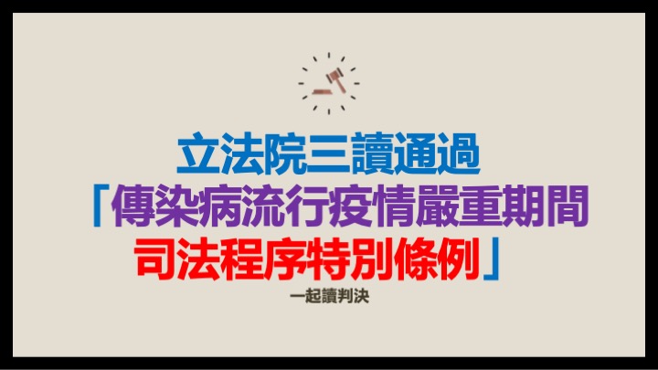 從2021年5月17日開始,因為疫情緊張的關係,從雙北的四個法院(基隆、士林、台北、新北)開始,紛紛延後庭期, … 繼續閱覽 立法院三讀通過「傳染病流行疫情嚴重期間司法程序特別條例」