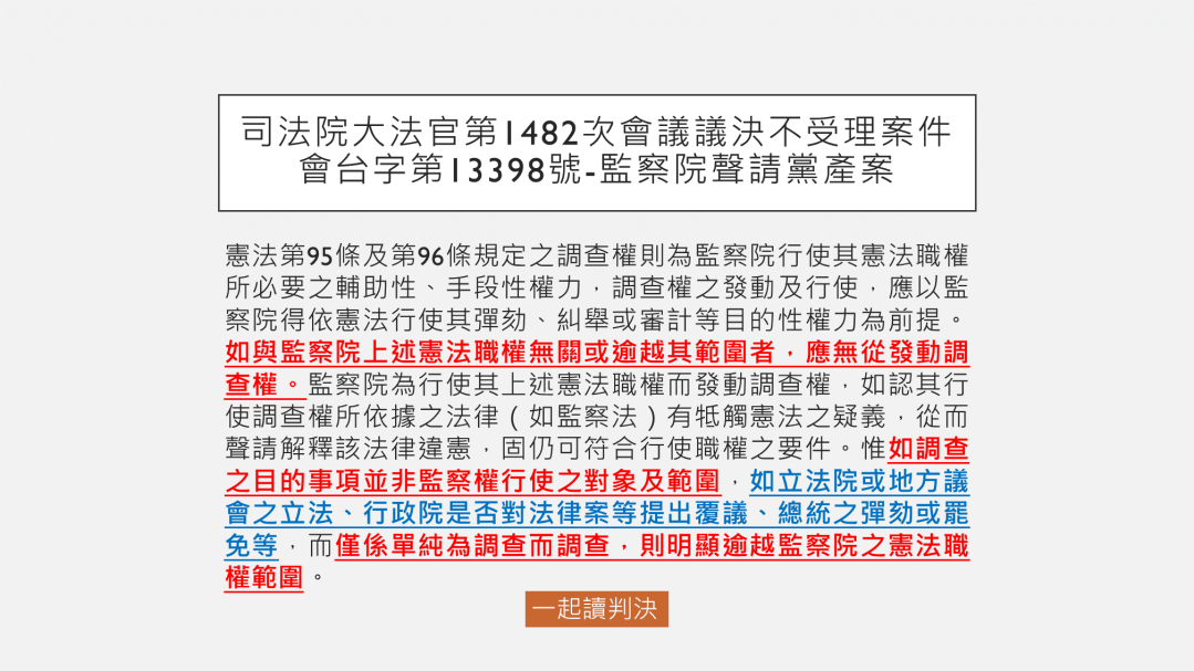在司法院針對監察院就黨產條例的釋憲聲請不受理決議中,多數意見指出監察院調查權行使的界線。 依照憲法第95條規定 … 繼續閱覽 監察院調查權的界線