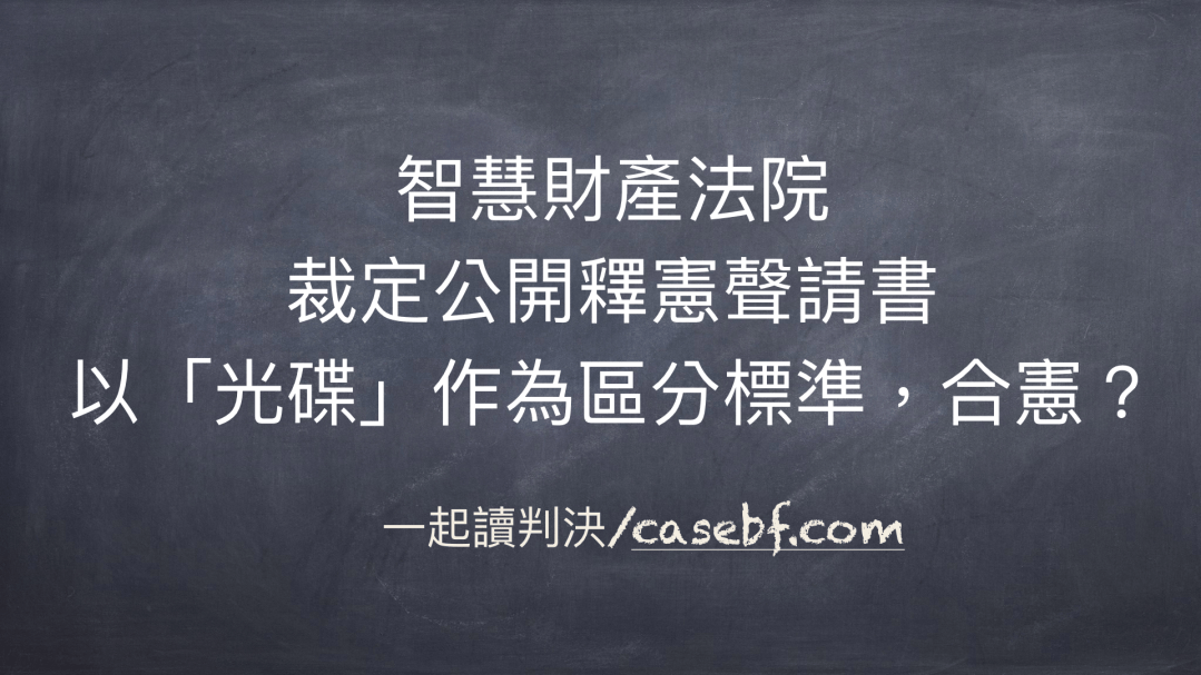 去年11月7日,一起讀判決的「以光碟作為區分標準,是否違憲?」一文介紹了智慧財產法院剛進入待審案件的釋憲聲請。 … 繼續閱覽 智財法院裁定公開釋憲聲請書