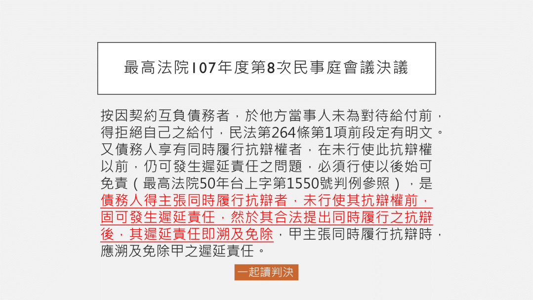 最高法院最近做出107年度第8次民事庭會議決議,這個案例事實來自去年11月高院法律問題座談會民事類提案第4號, … 繼續閱覽 行使同時履行抗辯後的遲延責任,是否溯及免除?