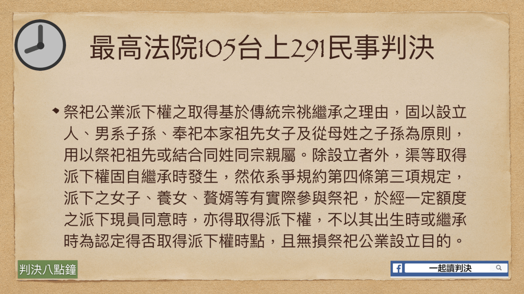祭祀公業是臺灣一種很特別的團體,由很久以前的祖先「設立人」捐助財產,以祭祀為目的,依過去的繼承觀念,派下員通常 … 繼續閱覽 變性之後,可否取得派下權?