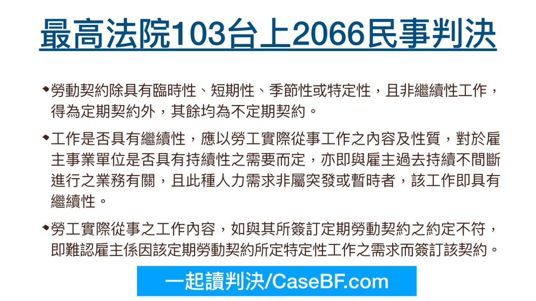 從民國85年起,某工程公司和幾位勞工簽訂「僱用定期契約人員契約書」,每年重新簽訂一年期。直到98年之後,不再續 … 繼續閱覽 什麼時候可以簽訂「定期勞動契約」?