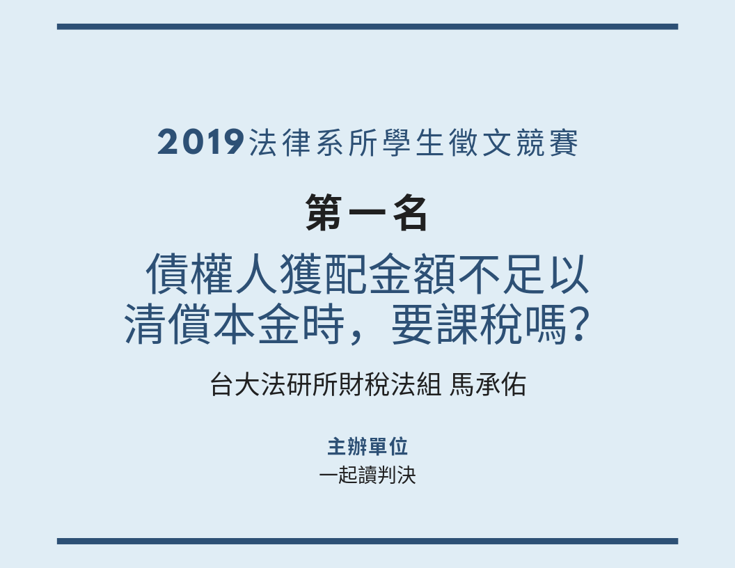 本文是台大法研所財稅法組研究生馬承佑的作品,在一起讀判決舉辦的第一次法律系所學生寫作徵文競賽,經6位評審評分加 … 繼續閱覽 債權人獲配金額不足以清償本金時,要課稅嗎?