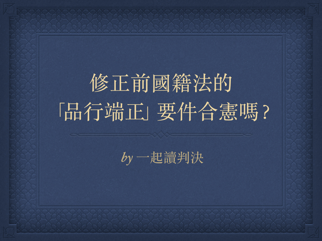 17 二月 201918 二月 2019 一起讀判決 憲法 品行要怎麼端正,才能歸化? 2016年12月21日修正前的國籍法第3條第1項第3款,原本規定外國人申請歸化須具備「品行端正,無犯罪紀錄」要 … 繼續閱覽 品行要怎麼端正,才能歸化?分享 按一下以分享至 Facebook(在新視窗中開啟) Facebook 按一下即可分享至 X(在新視窗中開啟) X 按一下以分享到 Telegram(在新視窗中開啟) Telegram 喜歡 正在載入...