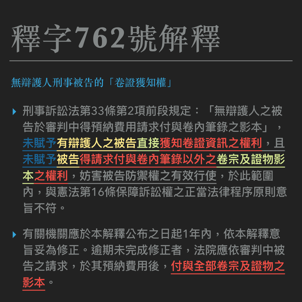 原本的規定 依照現在刑事訴訟法的架構,刑事被告的閱卷權利是交給辯護人行使,第33條第1項規定:「辯護人於審判中 … 繼續閱覽 釋字762號解釋:刑事被告的卷證獲知權