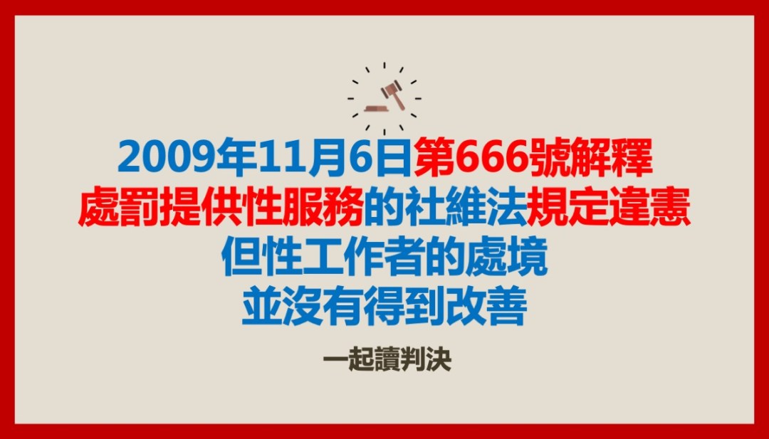 6 十一月 20207 十一月 2020 一起讀判決 憲法 2009年11月6日:大法官作出666號解釋,但性工作者的處境,並沒有得到改善 2009年5到9月間,兩位宜蘭地院簡易庭法官林俊廷(現為司法院民事廳法官)、楊坤樵(現為台北高等行政法院法官) … 繼續閱覽 2009年11月6日:大法官作出666號解釋,但性工作者的處境,並沒有得到改善分享 按一下以分享至 Facebook(在新視窗中開啟) Facebook 按一下即可分享至 X(在新視窗中開啟) X 按一下以分享到 Telegram(在新視窗中開啟) Telegram 喜歡 正在載入...