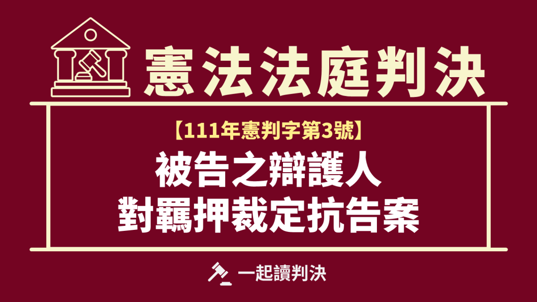 111年3月25日,大法官作出第三號憲法法庭判決,是關於偵查中受到羈押的被告,如果想要針對羈押裁定抗告時,辯護 … 繼續閱覽 第三號憲法判決:辯護人可以幫被告抗告嗎?