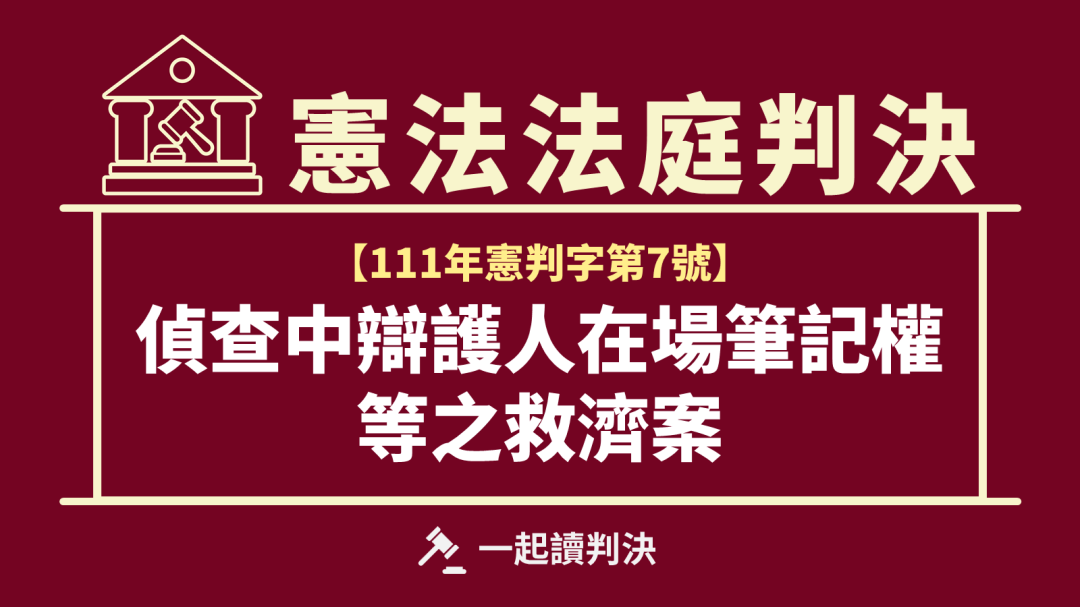 案件由來 刑事訴訟法第245條第2項規定:「被告或犯罪嫌疑人之辯護人,得於檢察官、檢察事務官、司法警察官或司法 … 繼續閱覽 111憲判字第7號:偵查中辯護人筆記權的司法救濟